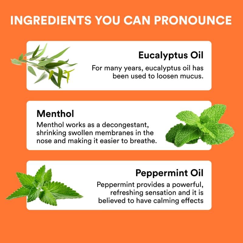 Ingredienti: mentolo, olio di eucalipto, olio di menta piperita, olio di menta speziata, olio di lavanda, olio di buccia di limone, olio di buccia d'arancia, olio di Wintergreen