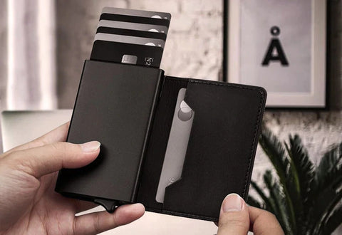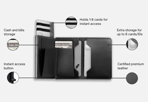 You will have more space than ever with the new slim profile design. It can seamlessly holds up to 14 cards & 20 Bills at a fraction of the size of a traditional wallet. And with the advanced trigger mechanism, just a push of your fingertip to select the card of your choice instantly. It’s a reimagination of what the modern wallet can be.